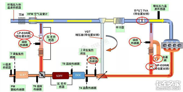 小贴士:国六车后处理系统比国五/国四车配置更多的排温传感器,配置了上游氮氧传感器测量原排的氮氧含量,实时的修正尿素喷射量,还配置了PM颗粒物传感器监控尾气中颗粒物是否合格。